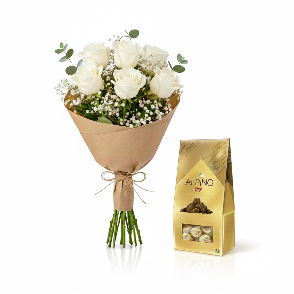 A combinação mais sofisticada do nosso catálogo. O combo Alpino de Neve une a serenidade das rosas brancas premium à cremosidade intensa do chocolate Alpino, resultando em um presente equilibrado e cheio de classe.
