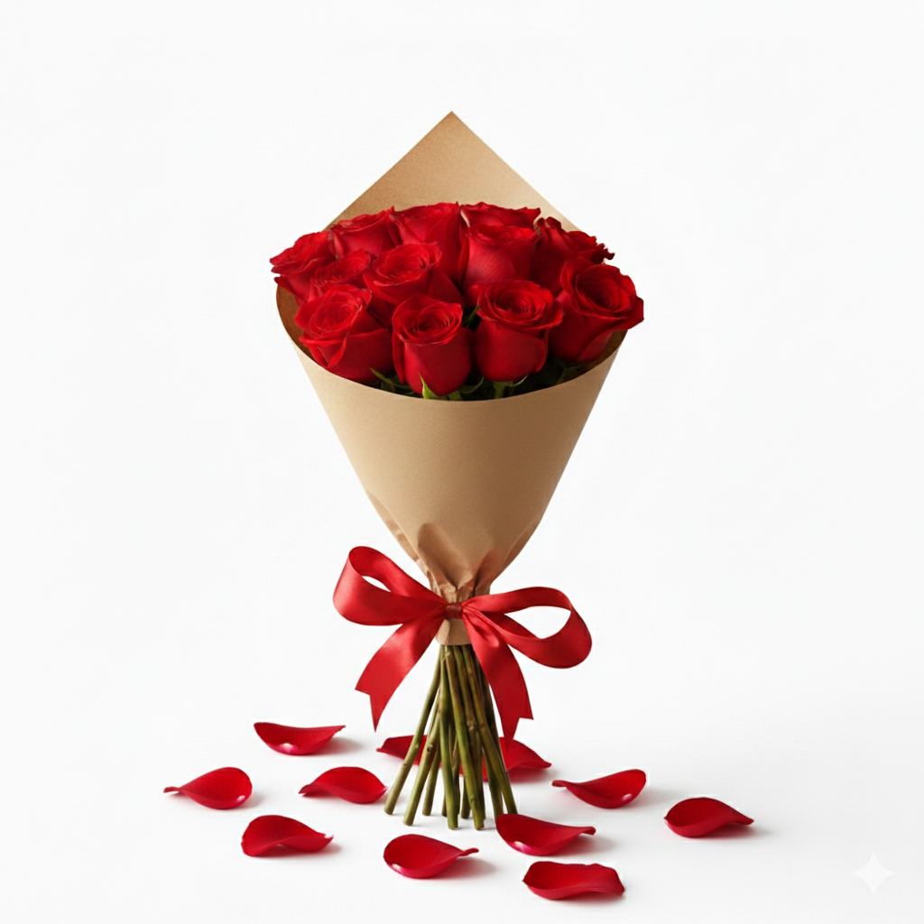 Um amarrado com 12 rosas premium vermelhas (todas juntinhas, sem folhagens), numa composição "clean" e elegante. O acabamento é feito com papel especial Kraft e laço de fita cetim.