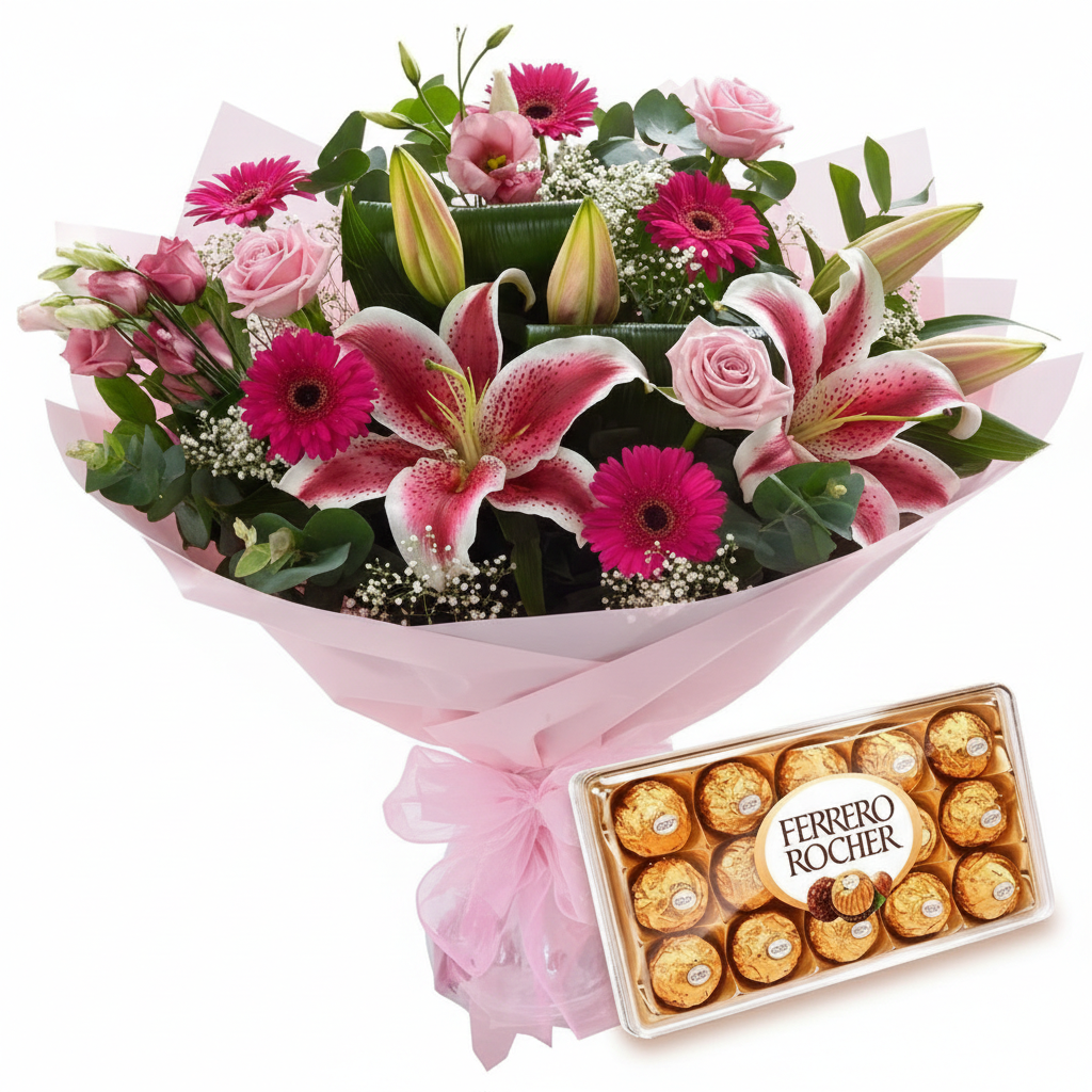 Este belo buquê apresenta uma combinação colorida e perfumada de flores em diversos tons de vermelho e rosa. Gérberas, rosas, lisianthus e lírios em uma harmoniosa combinação perfeita para surpreender e emocionar em datas especiais. Um presente especial para todos os momentos.
