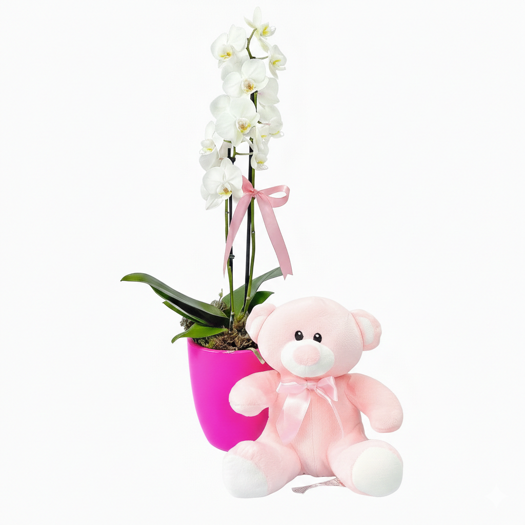 Surpreenda alguém especial com a combinação perfeita de natureza e ternura. Nossa Mini Orquídea no Vaso de Cerâmica, acompanhada por um adorável urso de pelúcia, é o presente ideal para expressar carinho e afeto em qualquer ocasião.