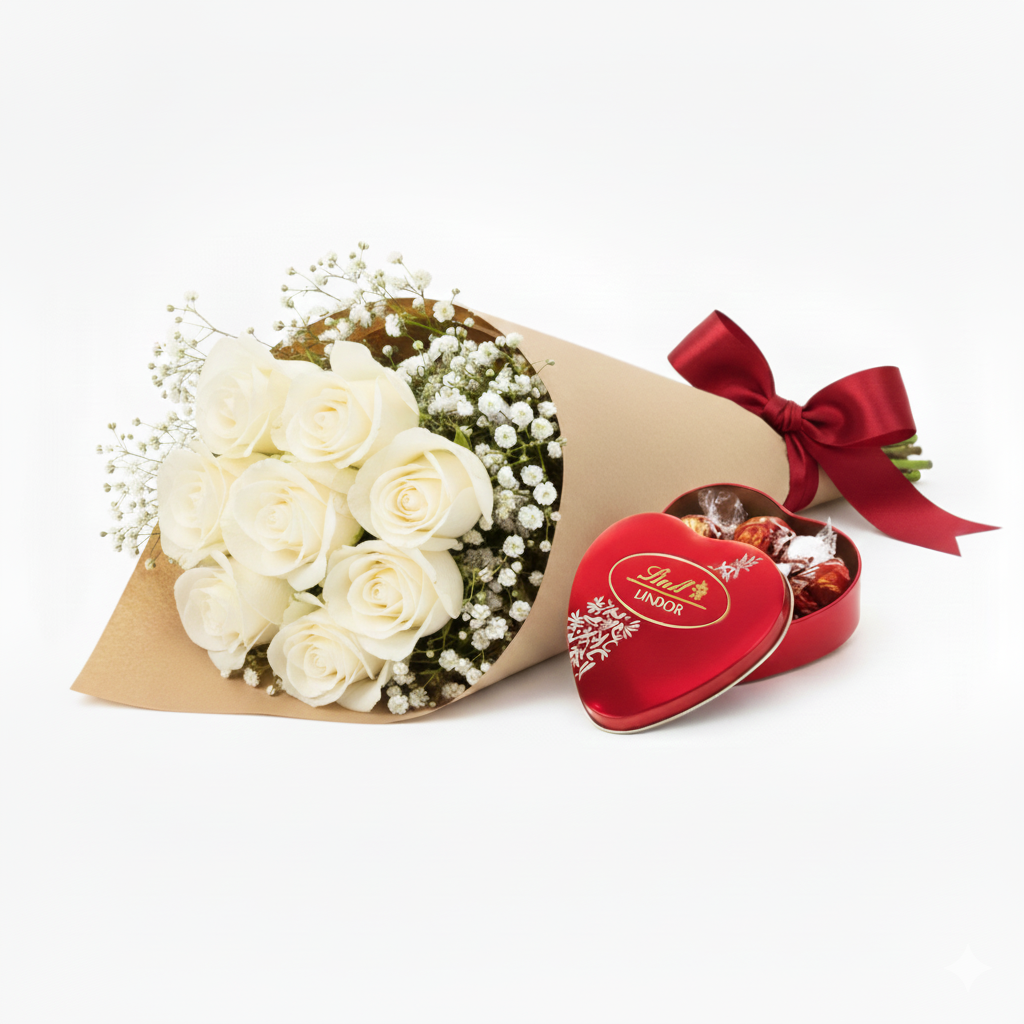 Composto por 8 rosas brancas frescas, símbolo de paz, pureza e amor sincero, esse buquê é cuidadosamente envolvido em papel kraft e finalizado com laço delicado. Para completar a experiência, acompanha chocolate Lindt, trazendo o equilíbrio perfeito entre a suavidade das flores e a doçura do chocolate suíço.