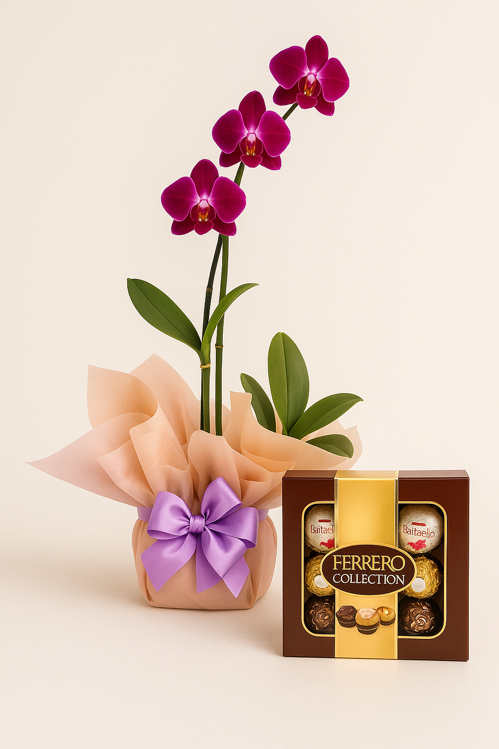 Uma orquídea denphal, elegante e cheia de charme, embalada em cores variadas finalizada com um laço delicado. Ao lado, uma caixa de Raffaello 150g ou Ferrero Collection, trazendo um toque especial e sofisticado ao presente. Um conjunto perfeito para surpreender com carinho e bom gosto — clássico, romântico e atemporal.