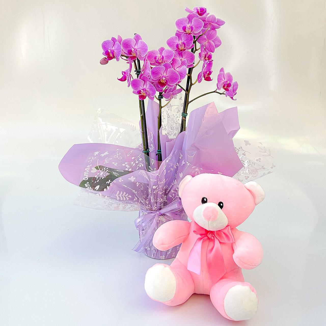 As pétalas delicadas da orquídea lilás carregam aquela beleza serena que encanta no primeiro olhar, como um carinho silencioso. O ursinho rosa, macio e acolhedor, chega para completar o gesto com ternura — quase como um abraço que fica mesmo quando a pessoa não está por perto.