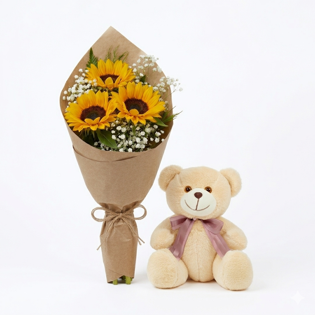 Surpreenda com um presente que transborda luz e carinho. Este combo exclusivo foi pensado para levar um sorriso instantâneo a quem você ama, combinando a energia solar das flores com a fofura de um amiguinho de pelúcia.